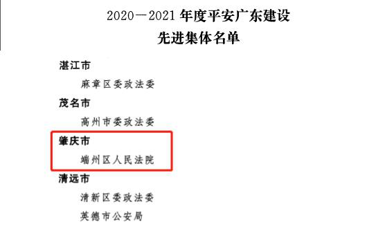 喜讯!端州法院荣获“平安广东建设先进集体”称号