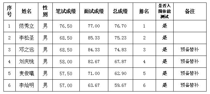 注:根据考试成绩由高到低的顺序,按照职位招录人数1:3比例确定参加体能测试对象,其中排名第3-6名的考生为预备替补人选,仅在排名1-2名的考生体能测试不合格的情况下才可按考试成绩的高低依次递补入围体检。