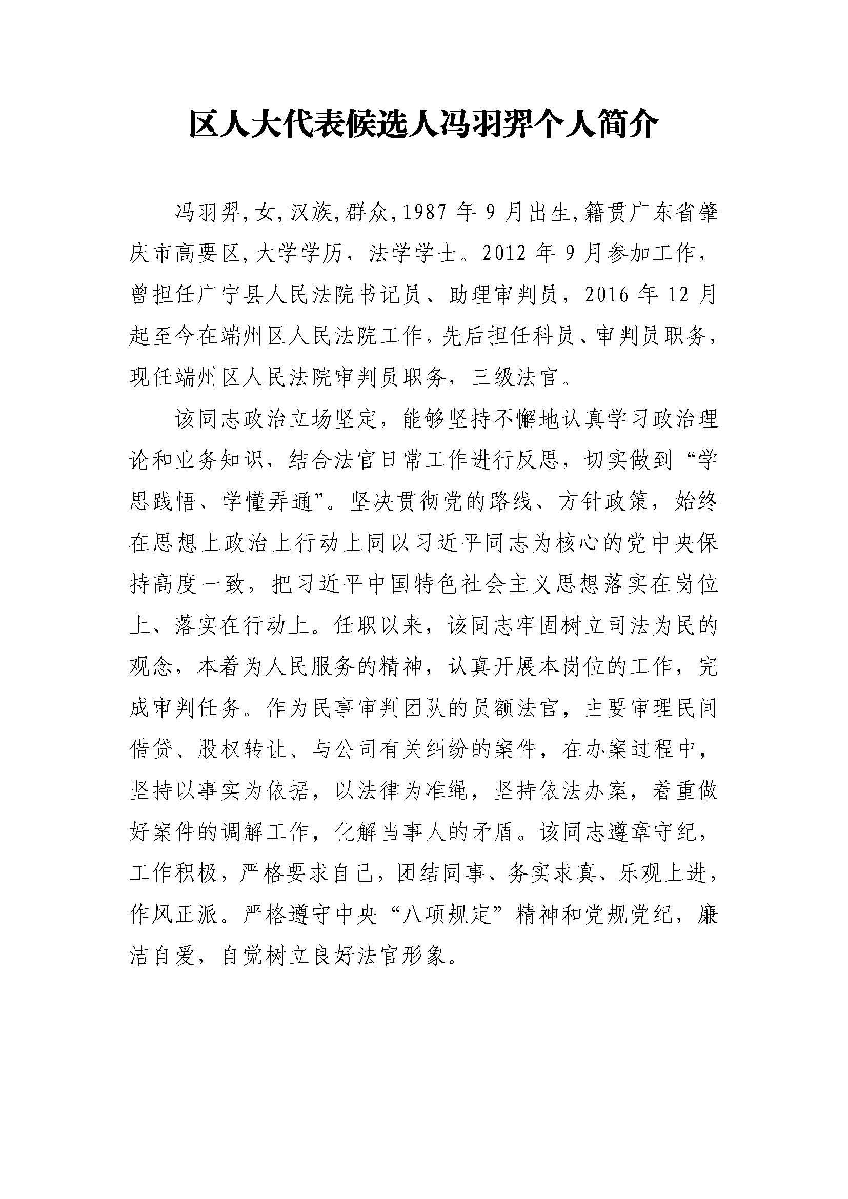 区人大代表候选人冯羽羿个人简介