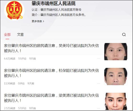 据了解,端州法院于5月16日在“今日头条”官方账号发布了3条失信被执行人信息推文,短短9天时间吸引了超过9.2万人次阅读,评论112条,获赞627个。在社会诚信体系日益完善的今天,“老赖”们的生存空间被持续压缩,一味地耍赖和逃避,只会面临更加严厉的法律后果,主动履行才是唯一且正确的选择!