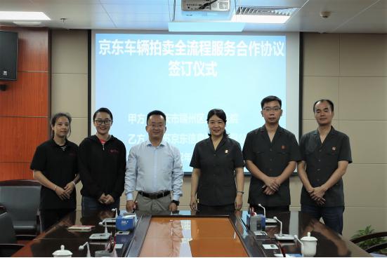 为解决执行中车辆处置执行难问题,提升司法评估拍卖工作技术水平,日前,端州法院与京东公司签订车辆拍卖全流程服务合作协议。端州法院党组成员谭松、执行局相关负责同志,京东公司拍卖部相关负责人出席签约仪式。