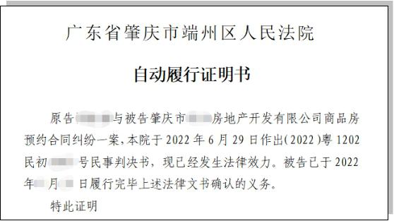 端州法院发出首份《自动履行证明书》