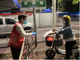 在封控区,深入楼栋为居民输送物资,动员群众积极配合核酸检测、信息登记等封控政策;