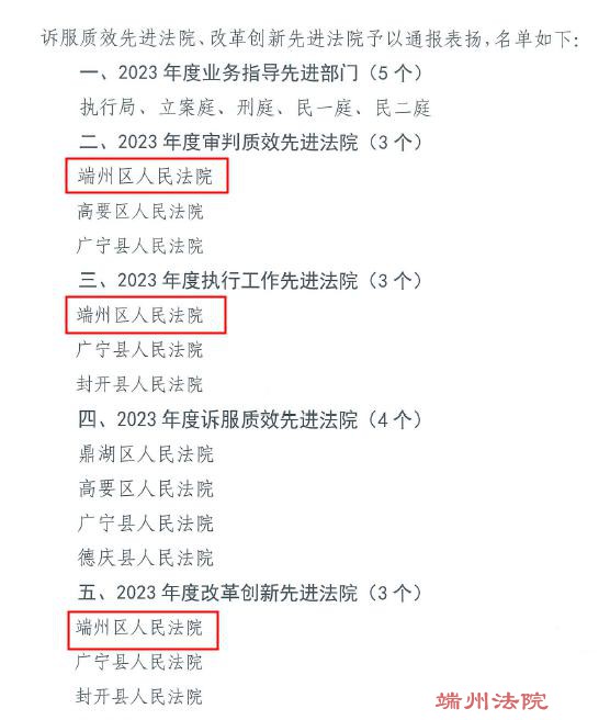 近日,肇庆中院对2023年度业务指导先进部门、审判质效先进法院、执行工作先进法院、诉服质效先进法院、改革创新先进法院予以通报表扬。