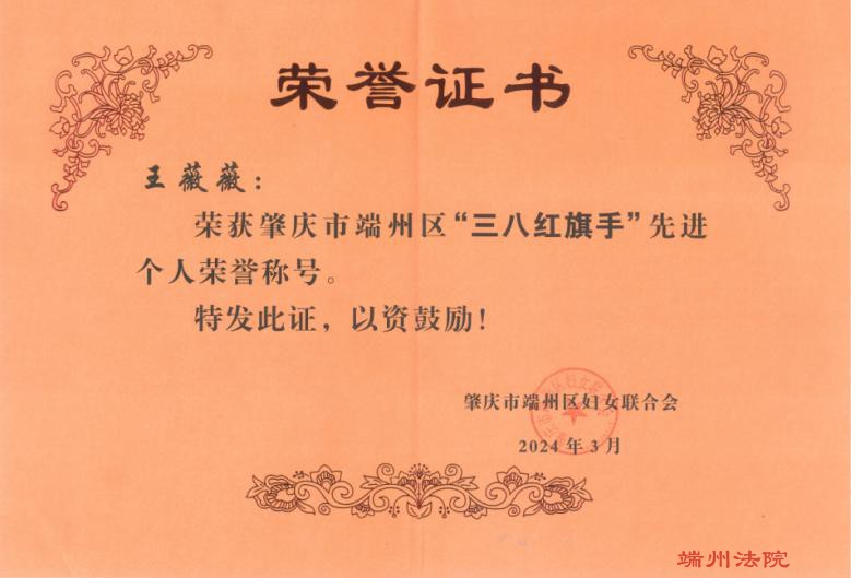 (图为我院王薇薇同志获评2023年度肇庆市端州区“三八红旗手”)