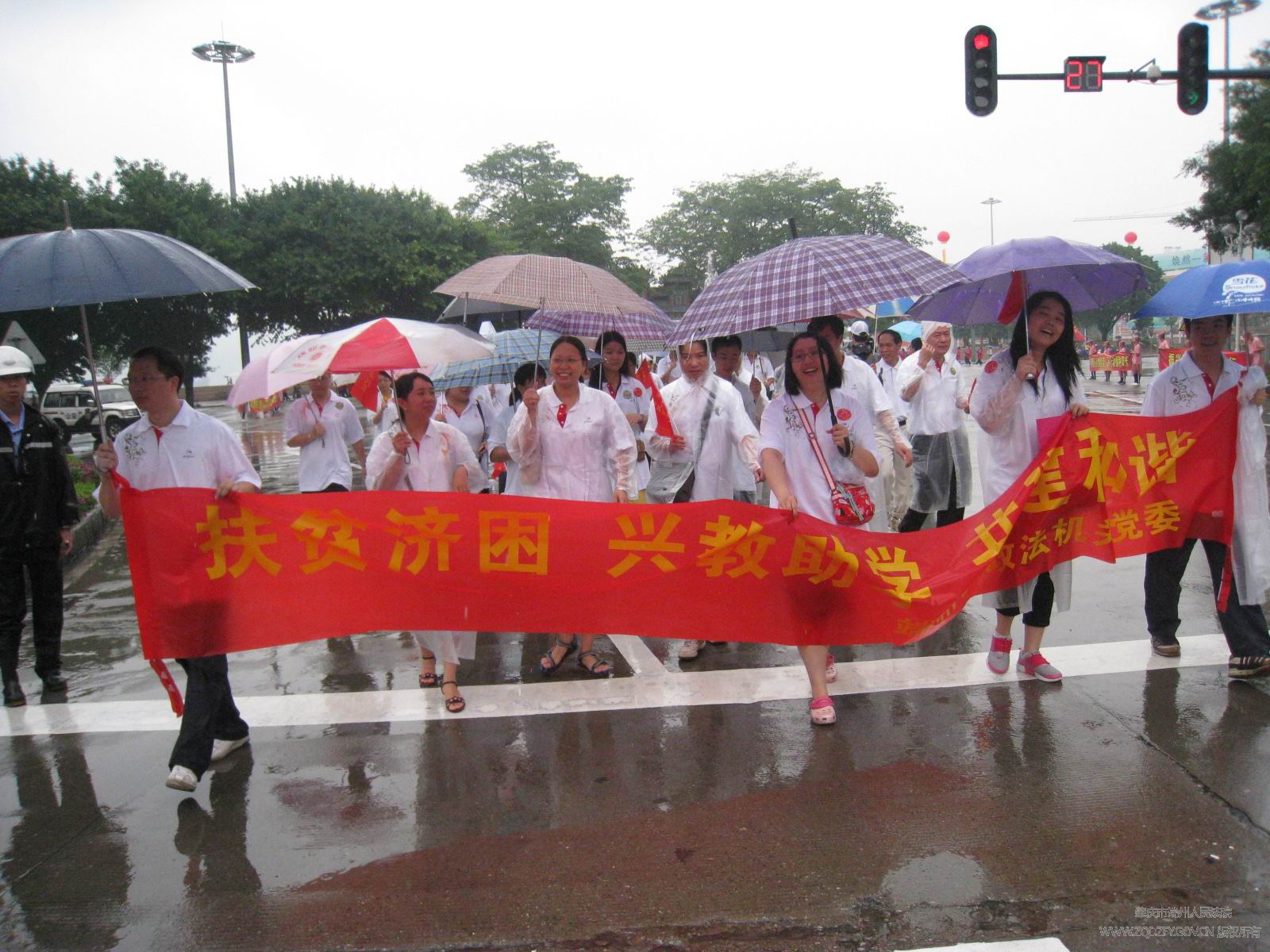 6月30日上午,我院副院长薛国新同志带领15名干警参加市“扶贫济困、教育基金万人行”募捐宣传活动,他们手持小旗帜,打着雨伞,踏着雨水,传递“人人奉献爱心、共建幸福家园”的理念,推进扶贫开发“双到”工作和支持贫困山区兴教助学。