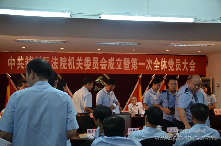 党员大会在雄壮的国歌声中拉开序幕。大会通过党员无记名投票方式选举产生薛国新、黄永健、罗芸、伍健、赵承杰、沈洁浪、伍凤娇七位同志为第一届机关党委委员,薛国新同志当选为党委书记,黄永健、罗芸同志为副书记。大会还选举产生黄永健、谭松、黄艳晖、黄敏琼、李肇军五位同志为我院第一届纪律检查委员会委员,黄永健同志当选为纪委书记,谭松同志为纪委副书记。新当选的机关党委书记薛国新代表首届“两委”班子对院党组和上级党委的信任和支持表示衷心的感谢,并表示将以党委成立为契机,开展好党建工作,努力在全院形成“抓党建带队建促审判”的良好工作氛围。