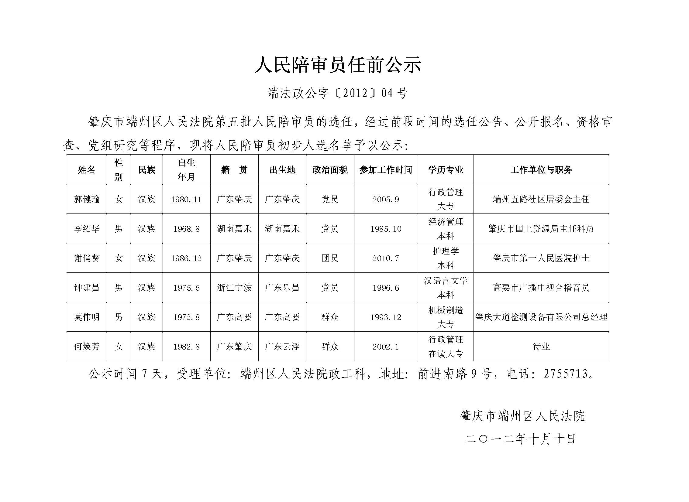 端州区人民法院第五批人民陪审员任前公示