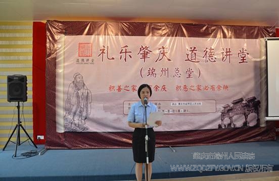 为进一步传播道德理念,弘扬文明新风,根据区文明办的部署要求,我院举办的“道德讲堂”总堂宣讲活动于5月13日上午在区青少年文化宫开讲。院领导方文、苏彤、黄永健与各部门干警代表、人民陪审员代表、区检察院代表以及肇庆学院学生代表等80多人参加了此次活动。