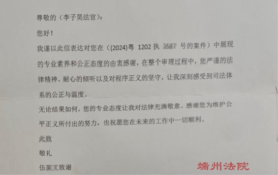 “在整个审理过程中,您严谨的法律精神、耐心的倾听以及对程序正义的坚守,让我深刻感受到司法体系的公正和温度……”近日,被执行人伍某的妻子熊某向法院送来一封感谢信,字里行间充满对法院工作的信任和感激。