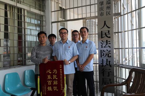 收到装修工程款后,胡某马上向端州法院执行工作人员送上一面“心系百姓为民解忧”的锦旗以表感谢,为执行工作人员司法为民点赞。