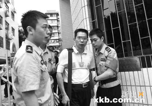 ■涉事男子未出法院门口即被民警带走。新快报记者王小明/摄
